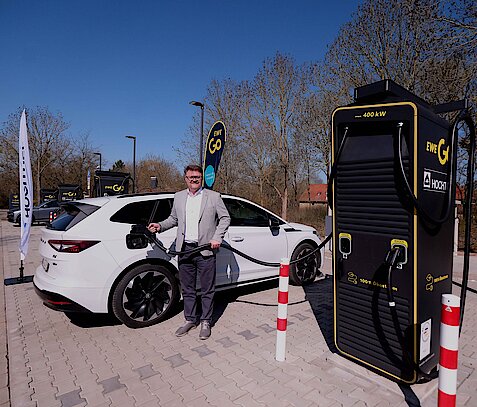 Im Rahmen des Deutschlandnetzes haben EWE Go und HOCHTIEF gemeinsam mit Bürgermeister Thorsten Feike (im Bild) in Duderstadt einen neuen Schnellladepark eröffnet. Acht Ladepunkte mit je 400 kW ermöglichen eine zuverlässige Ladung in nur 15–30 Minuten. Der barrierearme Standort wird mit 100 % Ökostrom betrieben und stärkt die Ladeinfrastruktur in der Region nachhaltig. Weitere Ladeparks sind bereits geplant.